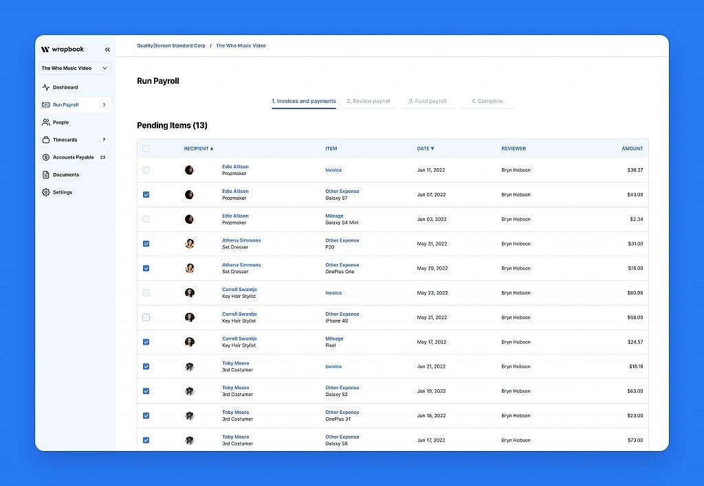 Additionally, Wrapbook’s all-in-onte approach gives production teams more control. Communication is clear and work flows fast. As an example, those running payroll on Wrapbook can push payments through right away—selecting individual timecards or selecting in batches.