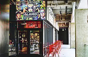 One of Alamo’s signature features is its food and drink service. The L.A. Drafthouse bar is stocked with 48 American craft beers on tap, in addition to ciders and kombucha. Patrons can order specialty, movie-themed cocktails like the L.A. Confidential, a spicy tequila drink with firewater bitters, off menus designed to look like ’80s VHS cases. The 95 percent from-scratch kitchen upstairs cranks out restaurant-quality entrees and spritzed up cinema classics, orderable not only in the spacious lobby but at your seat during a screening, another Alamo signature.