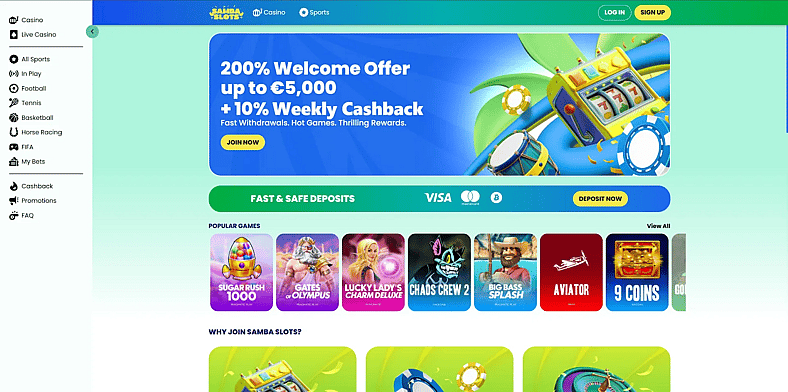 SambaSlots Casino stands out as one of the best Bitcoin betting sites, providing players with a secure and reliable crypto gambling experience. The crypto betting site features an easy-to-navigate design that works on both desktop and mobile devices.