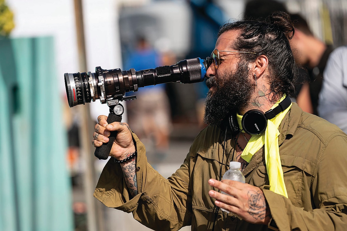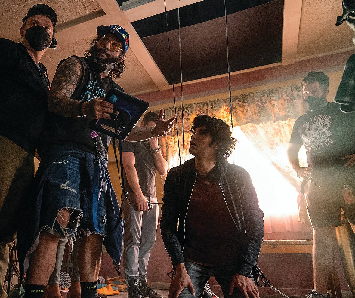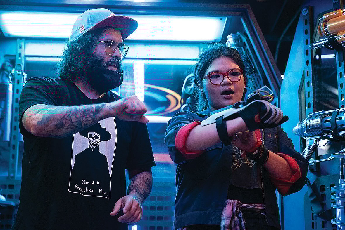 Main image: Blue Beetle director Ángel Manuel Soto and star Xolo Maridueña on set. Photo by Hopper Stone/SMPSP. All photos courtesy of Warner Bros. Pictures/™ & © DC Comics.
