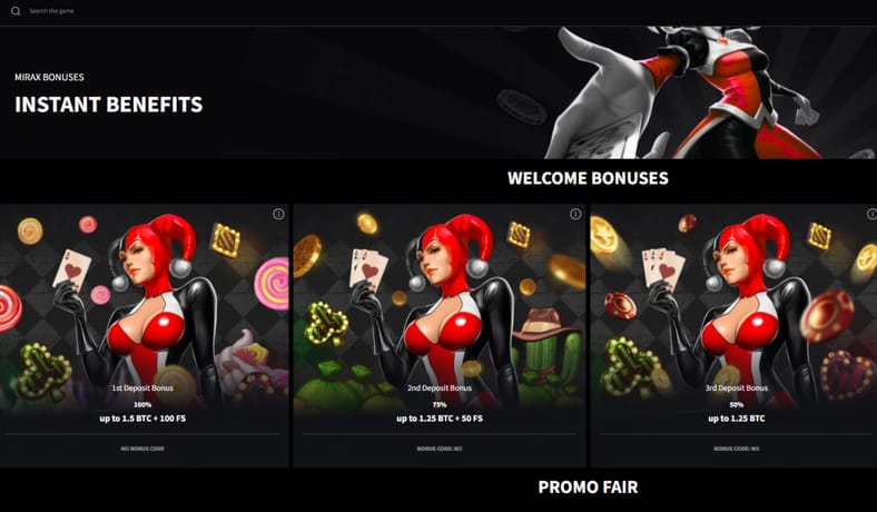| MIRAX | 325% up to 1.25 BTC + 150 Free Spins | Instant |