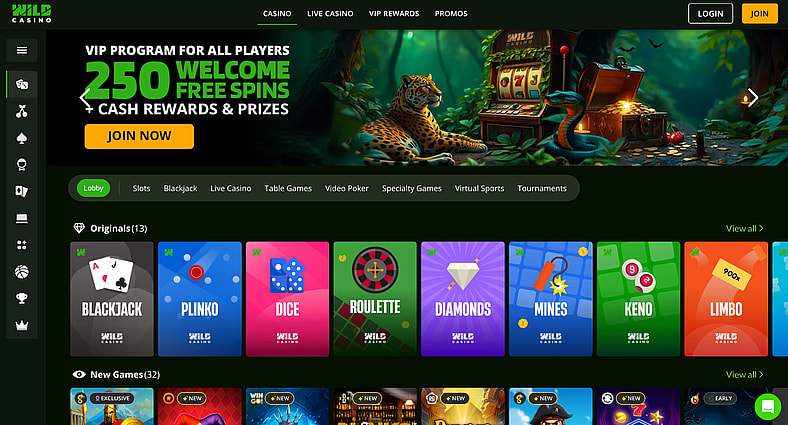 Wild Casino has positioned itself as a premier destination for players who want free spins on slots without the usual playthrough headaches. Its welcome offer includes 250 free spins spread across 10 days (25 spins on a different slot title each day), with zero wagering requirements on any winnings from those spins. This is one of the most player-friendly structures in the current US market.