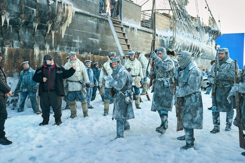 “The monster kills people. It’s not accidental,” says del Toro. “The creature is truly monstrous, killing the sailors, killing the wolves, ripping the jaw out of the hunter. But he’s also capable of freeing the ship, which is what we all are.”