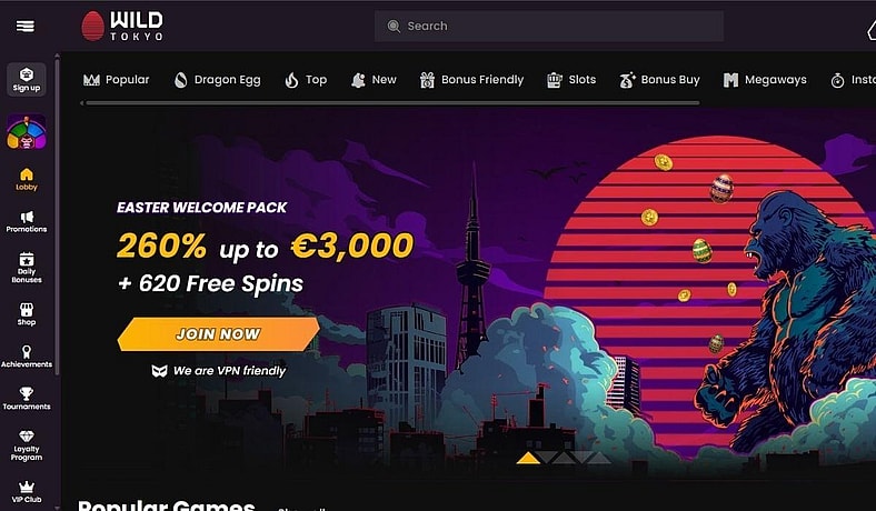 As one of the best Instant Withdrawal Casinos in Canada, Wild Tokyo offers a sleek aesthetic with quick Interac e-Transfer processing for Canadian players. We appreciate its reliable under-1-hour payout window and 600 free spins package.
