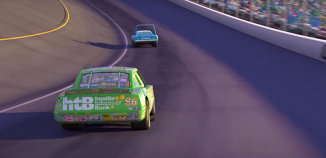 Cars did a cute bit of social commentary by making HTB — aka Hostile Takeover Bank — the sponsor of Lightning McQueen’s greatest rival, the previously mentioned Chick Hicks. He’s a notorious bad sport who will do anything to take over a lead. Or a bank, we guess.