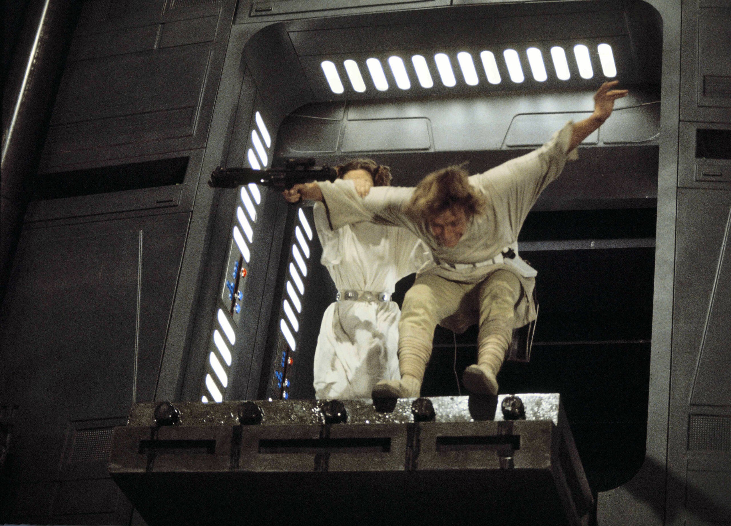 Carrie Fisher and Mark Hamill shoot one of the most exciting scenes on the Death Star set.