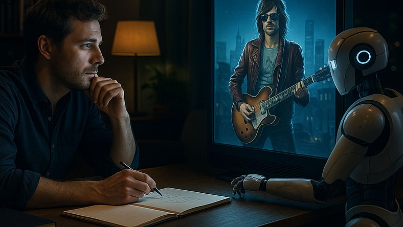 “The air smelled of vinyl, sweat, and revolution. Guitars screamed from Camden basements, and poets shouted lyrics through broken amps. But one voice didn’t belong—not really,” followed by ‘Back home, music was algorithmic perfection. The machines hadn’t stolen creativity; they’d simply done it better. Too perfectly. Too predictably. Until human noise was irrelevant.”